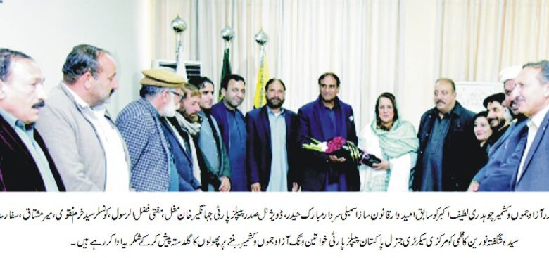 مظفرآباد(محاسب نیوز)قائمقام صدر آزاد جموں و کشمیر چوہدری لطیف اکبر سے مختلف سیاسی و سماجی شخصیات کی ملاقات، سیدہ شگفتہ نورین کاظمی کی تقرری پر مبارکباد،ایوان صدر میں قائمقام صدر آزاد جموں و کشمیر چوہدری لطیف اکبر سے سابق امیدوار قانون ساز اسمبلی سردار مبارک حیدر، ڈویژنل صدر پیپلزپارٹی جہانگیر خان مغل، مفتی فضل الرسول،سابق ایڈمنسٹریٹر میر مشتاق،کونسلر سید خرم نقوی، شبنم اعوان، ضیاد قاسم اور سفارت کاظمی نے ملاقات کی۔ملاقات کے دوران وفد نے سیدہ شگفتہ نورین کاظمی کو پاکستان پیپلزپارٹی خواتین ونگ آزاد جموں و کشمیر کی مرکزی سیکرٹری جنرل مقرر ہونے پر مبارکباد پیش کی اور قائمقام صدر چوہدری لطیف اکبر کو پھولوں کے گلدستے پیش کرتے ہوئے شکریہ ادا کیا۔اس موقع پر گفتگو کرتے ہوئے چوہدری لطیف اکبر نے کہا کہ سیدہ شگفتہ نورین کاظمی کی بطور مرکزی سیکرٹری جنرل تقرری پارٹی قیادت کا بہترین اور بروقت فیصلہ ہے۔انہوں نے کہا کہ خواتین ونگ پاکستان پیپلزپارٹی کا اہم اور مضبوط ستون ہے اور سیدہ شگفتہ نورین کاظمی اپنی صلاحیتوں، تجربے اور انتھک محنت سے تنظیم کو مزید فعال اور منظم بنانے میں کلیدی کردار ادا کریں گی۔انہوں نے اس عزم کا اظہار کیا کہ پاکستان پیپلزپارٹی آزاد جموں و کشمیر میں عوامی مسائل کے حل، جمہوری اقدار کے فروغ اور پارٹی کو گراس روٹ سطح تک مضبوط بنانے کے لیے اپنی جدوجہد جاری رکھے گی۔وفد کے اراکین نے بھی پارٹی قیادت پر مکمل اعتماد کا اظہار کرتے ہوئے کہا کہ خواتین کی سیاسی میدان میں مؤثر نمائندگی پارٹی کی ترقی پسند سوچ اور مضبوط تنظیمی حکمت عملی کی عکاس ہے۔