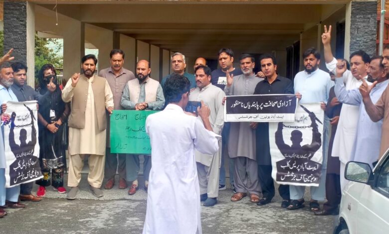 ایبٹ آباد (نمائندہ محاسب ) اسلام آباد نیشنل پریس کلب میں گھس کر صحافیوں کو تشدد کا نشانہ بنانے کے واقعہ کے خلاف ایبٹ آباد پریس کلب ایبٹ آباد یونین آف جرنلسٹس کا احتجاجی مظاہرہ واقعہ کو آزادی صحافت پر حملہ قرار دیا گیا۔ مظاہریں نے کتبے اٹھا رکھے جن پر پولیس کی جانب سے اسلام آباد نیشنل پریس کلب پر حملہ صحافیوں پر تشدد کے خلاف آزادی صحافت کے حق میں نعرے درج تھے۔ مظاہرین سے پریس کلب کے صدر سردار نوید عالم ، پاکستان فیڈرل یونین آ ف جرنلسٹس کے کے اسسٹنٹ سیکرٹری جنرل محمد شاہد چوہدری ایبٹ آباد یونین آف جرنلسٹس کے صدر عاطف قیوم سابق صدر ایبٹ آباد پریس کلب سردار شفیق ، عادل عباسی نے خطاب کرتے ہوئے کہا کہ پریس کلب پر حملہ آزادی صحافت پر حملہ ہے اس طرح کے واقعات سے صحافیوں کی آواز دبانے کی کوشش ہے۔ جسے کسی طو پر قبول نہیں کیا جائے گا۔ جمہوری حکومت میں اس طرح کے ہتھکنڈے استعمال کرکے انتشار پھیلانے کی کوشش کی جا رہی ہے۔ مقررین کا کہنا تھا کہ حکومت ہوش کے ناخن لے اس میں ملوث پولیس اہلکاروں کو قرار واقعی سزا دی جائے۔ مظاہرے میں پرنٹ ، الیکٹرانک ، سوشل میڈیا کے نمائندوں نے کثیر تعداد میں شرکت کی۔