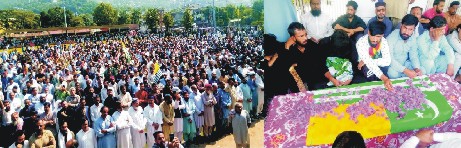 مظفرآباد۔آزادجموں وکشمیر جوائنٹ عوامی ایکشن کمیٹی کے لاک ڈاؤن احتجاج کے دوران نیلم پل پر پولیس کی فائرنگ سے شہید ہونے والے دو نوجوانوں کی نماز جنازہ کے ایچ خورشید فٹبال سٹیڈیم اپراڈہ میں ادا کی جارہی ہے،کثیر تعداد میں عوام الناس موجود ہیں۔