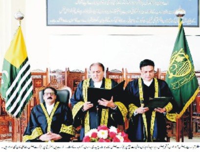 مظفرآباد(محاسب نیوز) نو تعینات جج سپریم کورٹ آزاد جموں و کشمیر جسٹس خالد یوسف چوہدری نے اپنے عہدے کا حلف اٹھا لیا۔ چیف جسٹس آزاد جموں وکشمیر جناب جسٹس راجہ سعید اکرم خان نے جسٹس خالد یوسف چوہدری سے حلف لیا۔حلف برداری کی تقریب سپریم کورٹ آزادجموں وکشمیر میں منعقد ہوئی جس میں سینیر جج سپریم کورٹ جسٹس رضا علی خان، چیف جسٹس ہائیکورٹ جسٹس سردار لیاقت حسین، جج ہائیکورٹ جسٹس خالد رشید چوہدری، سابق سینئر جج سپریم کورٹ جسٹس خواجہ محمد نسیم، سابق جج سپریم کورٹ جسٹس غلام مصطفی مغل، سابق چیف جسٹس ہائیکورٹ جسٹس صداقت حسین راجہ، چیئرمین سروس ٹریبونل، چیئرمین انوائرمنٹل ٹریبونل، وائس چیئرمین بار کونسل طارق بشیر، صدر سپریم کورٹ بار ایسوسی ایشن راجہ آفتاب احمد خان، سیکرٹری سپریم کورٹ بار ایسوسی، صدر ہائیکورٹ بار ایسوسی ایشن راجہ وسیم یونس، سیکرٹری ہائیکورٹ بار ایسوسی ایشن، صدر سینٹرل بار ایسوسی ایشن سید انیس الحسن گیلانی، بار کونسل اور آزاد کشمیر کی تمام بار ایسوسی ایشن کے عہدیداران و نمائندگان، سیکرٹریز حکومت سمیت آزادجموں وکشمیر بھر سے وکلاء نے کثیر تعداد میں شرکت کی۔ حلف برداری کی تقریب کا آغاز تلاوت کلام پاک سے ہوا۔ سیکرٹری قانون آزاد حکومت ریاست جموں وکشمیر ارشاد احمد قریشی نے خالد یوسف چوہدری کی بطور جج سپریم کورٹ تعیناتی کا نوٹیفکیشن پڑھ کر سنایا۔ جسٹس خالد یوسف چوہدری اس سے قبل جج ہائی کورٹ بھی رہ چکے ہیں اور جج سپریم کورٹ تعیناتی کے وقت بطور کسٹوڈین جائیداد متروکہ فرائض انجام دے رہے تھے۔