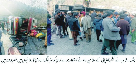 پٹہکہ(تحصیل رپورٹر)وادی نیلم شاردا سے مظفرآباد آنے والی کوسٹر کو شاہرائے نیلم چھلپانی کے مقام پر حادثہ مسافر بس تیز رفتاری کے باعث سڑک پر ہی الٹ گئی 10 مسافر زخمی ہو گے حادثے کی اطلاع ملتے ہی تحصیل انتظامیہ پٹہکہ اور ریسکیو ٹیمیں فوری موقع پر پہنچ گئیں جنہوں نے زخمیوں کو فوری ہسپتال منتقل کیا حادثہ گاڑی کھٹارہ ہونے اور تیز رفتاری کے باعث ہوا اللہ نے مسافر کوسٹر کو بڑے حادثے سے بچا لیا تفصیلات کے مطابق وادی نیل شاردا سے مظفرآباد آنے والی کوسٹر نمبر 1406 کو کہوڑی پل کے قریب چھلپانی موڑ میں حادثہ پیش آیا جس کے نتیجہ میں دس کے قریب مسافر زخمی ہو گئے جن کو فوری طور پر ریسکیو کرتے ہوئے سی ایم ایچ منتقل کر دیا گیا حادثے کی اطلاع ملتے ہی تحصیلدار پٹہکہ راجہ فرخ قدوس،نائب تحصیلدار انصیر علی مغل،ٹریفک پولیس کے آفیسران،تھانہ پولیس کہوڑی کی نفری اور ریسکیو 1122 اور ریسکیو جموں کشمیر یونائیٹڈ موؤمنٹ کے اہلکاران فوری جائے حادثہ پر پہنچ گے جنہوں نے زخمی ہونے والے مسافروں کو فوری سی ایم ایچ منتقل کر دیا حادثہ گاڑی کے کھٹارہ ہونے اور تیز رفتاری کے باعث پیش آیا اکثر پرانی کوسٹریں اوور لوڈ کیساتھ تیز رفتاری سے چلتی ہیں جس کے باعث حادثات رونما ہوتے ہیں کوسٹر ڈرائیور سے بے قابو ہو کر سڑک پر ہی الٹ گئی تاہم مسافر کوچ کسی بڑے حادثے سے بچ گئی،
