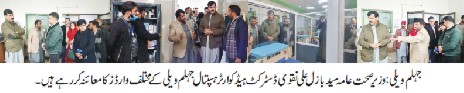 ہٹیاں بالا (اسلم مرزا سے)وزیر صحت حکومت آزاد جموں و کشمیر سید بازل علی نقوی کا ضلع جہلم ویلی کا تفصیلی دورہوزیر صحت حکومت آزاد جموں و کشمیر سید بازل علی نقوی نے بروز بدھ ضلع جہلم ویلی کا تفصیلی دورہ کیا۔ جہلم ویلی پہنچنے پر ڈاکٹر بشرہ شمس، ڈسٹرکٹ ہیلتھ آفیسر ڈاکٹر طاہر رحیم مغل، میڈیکل سپرنٹنڈنٹ ڈاکٹر محمد یاسین اور دیگر متعلقہ افسران نے وزیر صحت کا پرتپاک استقبال کیا۔دورے کے دوران وزیر صحت نے ضلعی ہیڈ کوارٹر ہسپتال جہلم ویلی کے مختلف شعبہ جات کا تفصیلی معائنہ کیا، جن میں او پی ڈی، ایمرجنسی، لیبر روم، میڈیکل وارڈز، فارمیسی، لیبارٹری اور دیگر سہولیات شامل تھیں۔ اس موقع پر ڈسٹرکٹ ہیلتھ آفیسر ڈاکٹر طاہر رحیم مغل اور ایم ایس ڈاکٹر محمد یاسین نے وزیر صحت کو ہسپتال میں دستیاب طبی سہولیات، ادویات کی فراہمی، عملے کی موجودہ صورتحال، مریضوں کی تعداد اور درپیش مسائل سے متعلق تفصیلی بریفنگ دی۔اس موقع پر گفتگو کرتے ہوئے وزیر صحت سید بازل علی نقوی نے کہا کہ حکومت آزاد جموں و کشمیر عوام کو معیاری اور بروقت طبی سہولیات کی فراہمی کے لیے عملی اقدامات کر رہی ہے۔ انہوں نے کہا کہ دور دراز اور پسماندہ علاقوں میں صحت کی سہولیات کو بہتر بنانا حکومت کی اولین ترجیحات میں شامل ہے۔ ہسپتالوں میں بنیادی سہولیات، جدید طبی آلات اور ادویات کی دستیابی کو ہر صورت یقینی بنایا جائے گا۔وزیر صحت نے مزید کہا کہ محکمہ صحت آزاد کشمیر عوام کو بہتر طبی خدمات فراہم کرنے کے لیے کوشاں ہے اور 20 جنوری کے بعد ہیلتھ کارڈ کی صورت میں آزاد کشمیر کے عوام کو مفت علاج معالجے کی سہولیات میسر ہوں گی۔ انہوں نے کہا کہ آزاد کشمیر کے دور دراز علاقوں میں بھی صحت کی سہولیات پہنچائی جا رہی ہیں اور طبی شعبہ دن بدن بہتری کی جانب گامزن ہے۔انہوں نے ہسپتال انتظامیہ کو ہدایت کی کہ مریضوں کے ساتھ خوش اخلاقی اور ہمدردانہ رویہ اپنایا جائے اور علاج معالجے کے معیار پر کسی قسم کا سمجھوتہ نہ کیا جائے۔ وزیر صحت نے ڈاکٹروں اور پیرا میڈیکل اسٹاف کی شبانہ روز محنت کو قابلِ تحسین قرار دیتے ہوئے کہا کہ حکومت ان کے مسائل کے حل کے لیے ہر ممکن تعاون فراہم کرے گی۔وزیر صحت نے کہا کہ ہسپتال کو درکار سہولیات، عملے کی کمی اور دیگر مسائل کو ترجیحی بنیادوں پر حل کیا جائے گا تاکہ عوام کو بہتر سے بہتر طبی سہولیات میسر آ سکیں۔ بعد ازاں انہوں نے مختلف بی ایچ یوز (BHU) کے لیے فرسٹ ایڈ کٹس بھی تقسیم کیں۔ دورے کے اختتام پر وزیر صحت نے مریضوں اور ان کے لواحقین سے ملاقات کی اور فراہم کی جانے والی طبی سہولیات کے بارے میں آگاہی حاصل کی۔