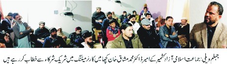 جہلم ویلی (بیورو رپورٹ)جماعت اسلامی آزاد کشمیر گلگت بلتستان کے امیر ڈاکٹر محمد مشتاق خان نے کہاکہ آمدہ انتخابات متناسب نمائندگی کے تحت کرانے کے لیے حکومت آئین میں ترمیم لائیجہلم ویلی حلقہ 6 میں تقریبات سے خطاب کرتے ہوئے انہوں نے کہا کہ،ایم ایل ایز کی تقرریو ں،تبادلوں اور سکیموں کے اختیار ختم کر کے ان کو قانون سازی،ریاست کی ترقی اور خودکفالت کی طرف لانے اور بے وزگار نوجوانوں کے روزگار کے حوالے سے بڑے بڑے منصوبے بنانے پر لگایاجائے،عوام نے جماعت اسلامی کو موقع دیا تو مفت تعلیم اور صحت کا اہتمام کریں گے،بزرگوں،بیواؤں اور بے روزگار افراد کے لیے وظائف فراہم کریں گے،ریاست کے دونوں آزاد خطوں کو اسلامی فلاحی ریاست بنائیں گے اور بقیہ کشمیرکی آزادی کے لیے عملی اقدامات کریں گے،،اس موقع پر جہلم ویلی حلقہ 6چھٹیاں،سینا دامن اور کچھا سے سینکڑوں افراد جماعت اسلامیں شامل ڈاکٹر محمد مشتاق خان نے حلف لیا،تقریبا ت سے خطاب کرتے ہوئے ڈاکٹر محمد مشتاق خان نے کہاکہ جماعت اسلامی کشمیرکی وحدت اور حق خودارادیت کے حوالے سے کوئی کمپورومائز نہیں کرے گی،دو کروڑ کشمیریوں کوحق خودارادیت دینے کا عہد دنیا پورا کرے،بیس کیمپ کی قیادت نے جہاں عوام کے مسائل حل نہیں کیے وہیں بقیہ کشمیرکی آزادی کے لیے بھی اپنا مطلوبہ کردار ادا نہیں کیا جماعت اسلامی عوامی مسائل بھی حل کرے گی اور بقیہ کشمیرکو بھی آزاد کرائے گی۔